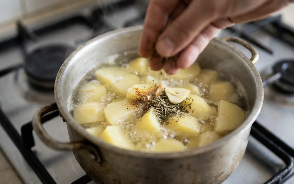 Sol u pravom trenutku: posolite nakon što voda zakipi i krumpir već mirno krčka. Tako se sol ravnomjernije rasporedi i okus bude jasniji. Nedovoljno posoljen krumpir uvijek djeluje “prazno”, čak i kad ga prelijemo maslacem.